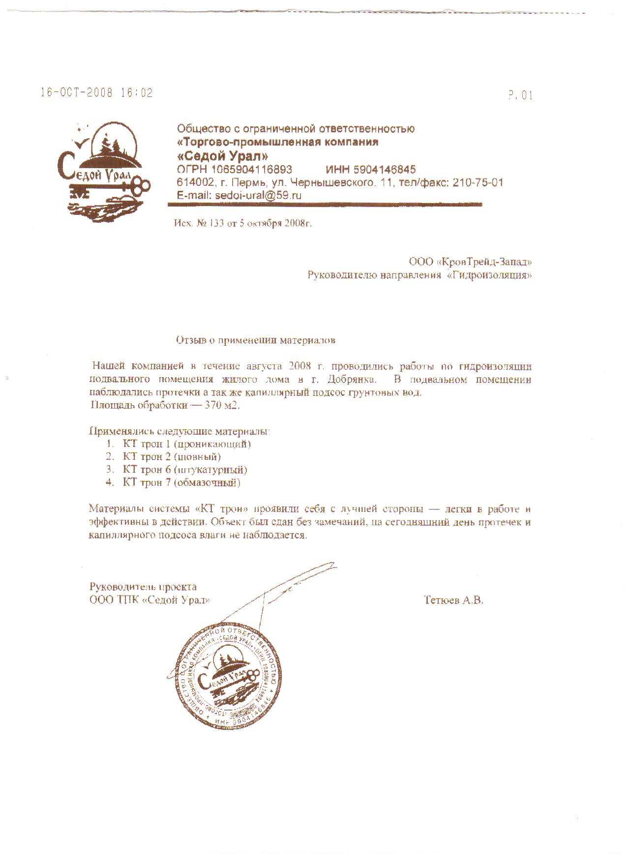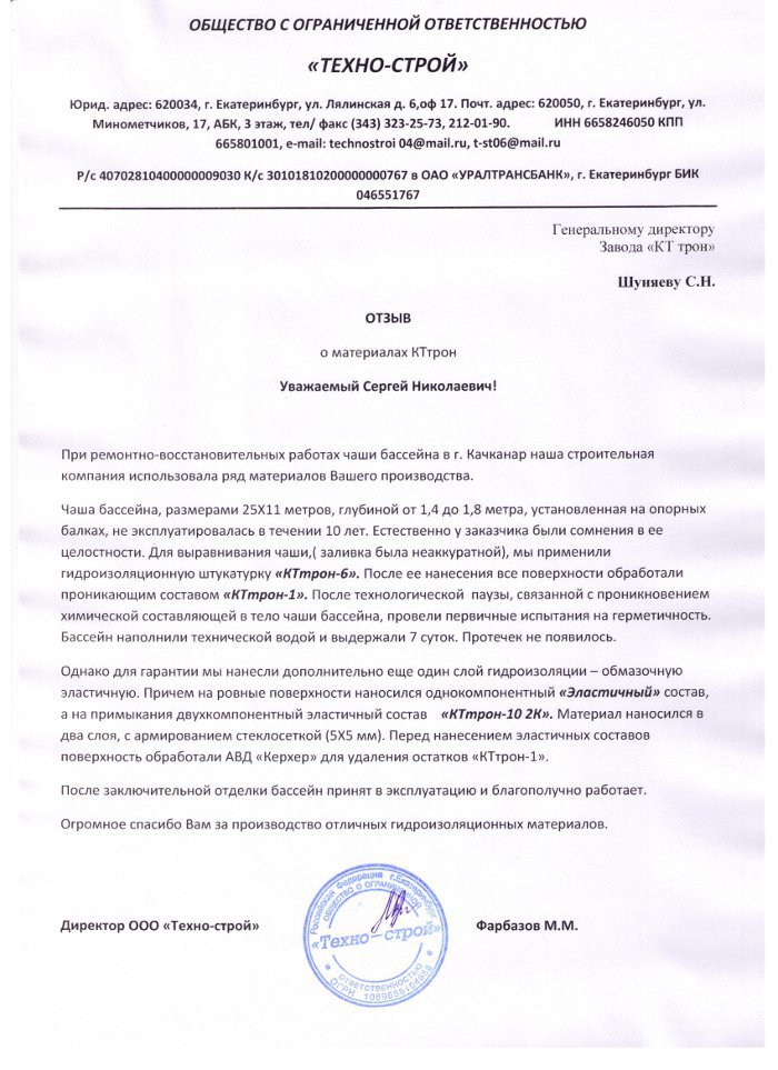 - Стройиспытания, г.Екатеринбург протокол №5400 на КТтрон-1, КТтрон-2, КТтрон-3, КТтрон-5, КТтрон-7