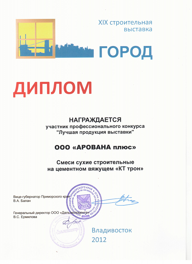 Диплом_XIX строительная выставка город_Владивосток 2012